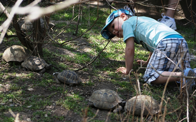 Gyerekbarát attrakciók is várják itt a kicsiket. Az egyik a pónin való lovaglás, a másik az állatsimogató. Sőt van egy harmadik is: hétvégénként be lehet menni egy kifutóba, ahol egy gondozó jelenlétében meg lehet simogatni a sok szárazföldi teknős valamelyikét. Ők békésen tűrik ezt. Közben ugyanide járnak ki a gyűrűsfarkú makik (katták) és a vöröshomlokú makik is, ha van kedvük emberek közé jönni. Általában van kedvük. Őket ugyan nem szabad megsimogatni, de éppen ezért van nagy pedagógiai értéke ennek a kifutónak. Itt tanulják meg a gyerekek úgy megfigyelni közelről, rácsok nélkül az állatokat, hogy közben ne akarják megfogni őket. Egyáltalán nem okoz ez konfliktust! Amíg én ott nézelődtem, minden gyerek megértette, hogy csak a teknősöket foghatja meg. A makikat a gondozónál lévő gyümölcsökkel szabad etetni, ha valaki feltétlenül ezt szeretné. Sajnos itt is figyelni kell, hogy a rácson kívülről ne etessék mindenfélével a makikat (jellemzően a felnőttek).
