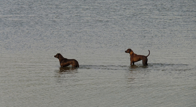 A nagy Duna-ágban is több kavicspad áll ki a vízből. Eleinte csak néhány tőkés récét láttam pihenni rajtuk, majd odaszállt egy dolmányos varjú, aztán még egy és még egy. Kb. öt perc alatt már feketéllett a kavicspad a varjaktól. Egyetlen vetési volt köztük, a többi mind szürke (szeretem így hívni a dolmányosokat magamban, mert Fekete István könyvein nőttem fel). Ittak a vízből, keresgéltek a kavicsok között, rendezték egy kis kergetőzéssel a „ki az erősebb” kérdéseket. A békés esti rituálénak hirtelen szakadt vége: érkezett két erőtől duzzadó, fiatal kutya, akik látható örömmel kergették szét a madarakat. Szinte vigyorogtak a boldogságtól. Egyetlen valami nem repült fel előlük: egy sziklaszerű tárgy (valami bedobott nagyobb szemét lehet). Hiába futottak feléje, nem mozdult. A kutyák megtorpantak. Hangos ugatásba kezdtek, látszatrohamokat indítottak, de a valami nem szállt fel. Egymásra néztek, nagyokat ugrottak, de szinte egyhelyben. Gondosan ügyeltek, nehogy közelebb kerüljenek ehhez az izéhez, ami szemmel láthatóan nem fél tőlük. Mire a gazdájuk magához hívta őket, én már hangosan nevettem a két zöldfülű bajnokon.