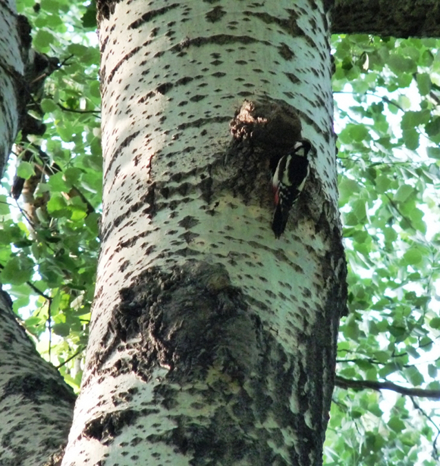 Itt hallottam meg a fejem fölül az éktelen sivalkodást: fakopáncs fiókák kérik az ennivalót. Illetve nem kérik, hanem folyamatosan követelik, olyan kétségbeesetten, mintha nem kapnának átlagosan tízpercenként újabb és újabb adagot a szüleiktől. Hamar megtaláltam az odú bejáratát egy nyárfán, jó magasan. Megvártam, amíg a szülők hármat-négyet fordulnak. Nem zavartatták magukat. Fényképezni azonban nehéz volt őket, mert az ennivalóval teljesen bebújtak az odúba. A Kerepesi temetőben látott nagy fakopáncs szülők csak megtámaszkodtak a fán és beadogatták a rovarokat, kellemesen hosszú időt hagyva a fényképezésre. Gondolom, itt a szigetiek még kisebbek, ezért be kell menni hozzájuk az odú aljára.