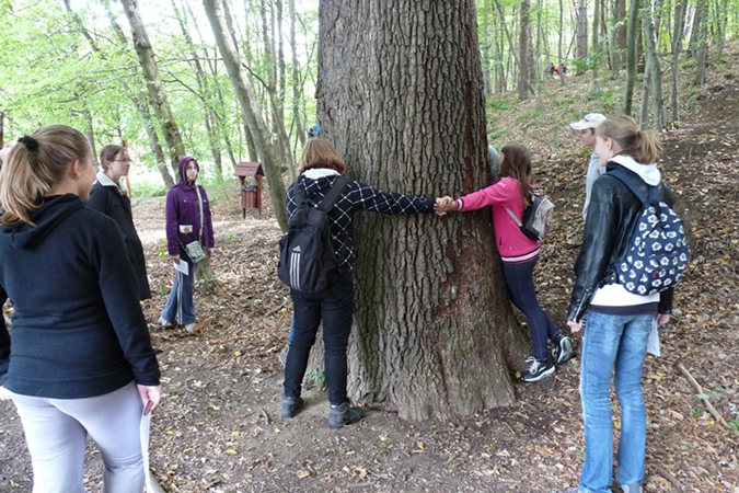 Megismerkedtünk a fatörzs szerkezetével, melyet el is játszottunk, önmagunkból alakítva ki az egyes részeket. Néhányan középen az évgyűrűket jelképezték, vagyis az elhalt fatestet. Őket állták körül az élő fatest részei. Ezután a kambium következett, vagyis az az osztódó szövet, ami minden évben új és új szállítócsöveket hoz létre. Kívül az élő háncstest övezi a kambiumot. A régi (évekkel korábbi) háncstest lassan kéreggé alakul, felszakadozik és leválik a törzsről. Egy-két emberünk még arra is maradt, hogy ők legyenek a fa gyökere és levelei.