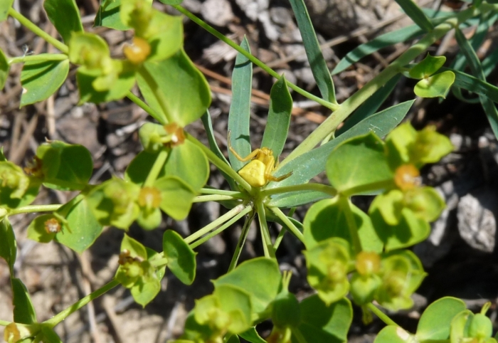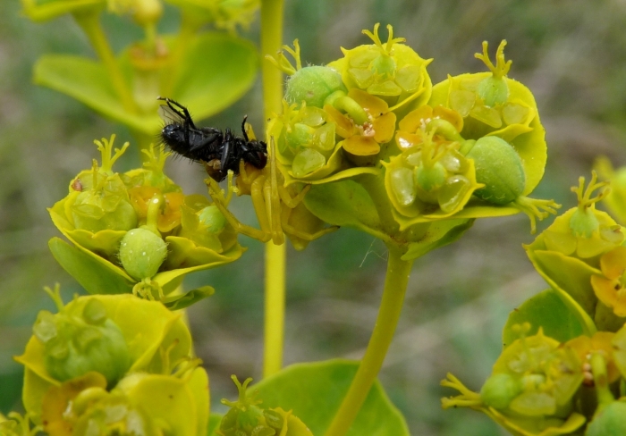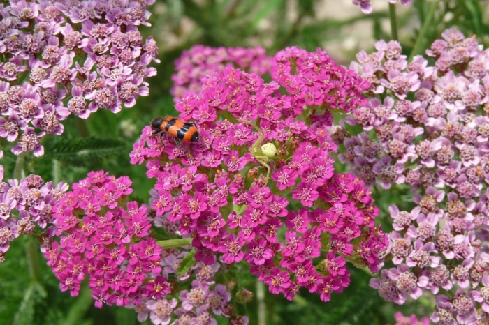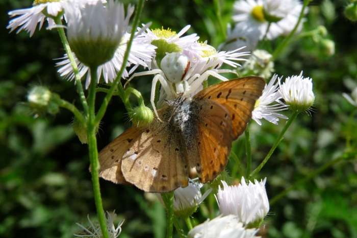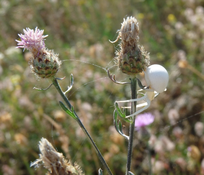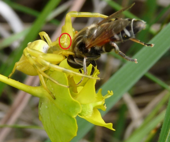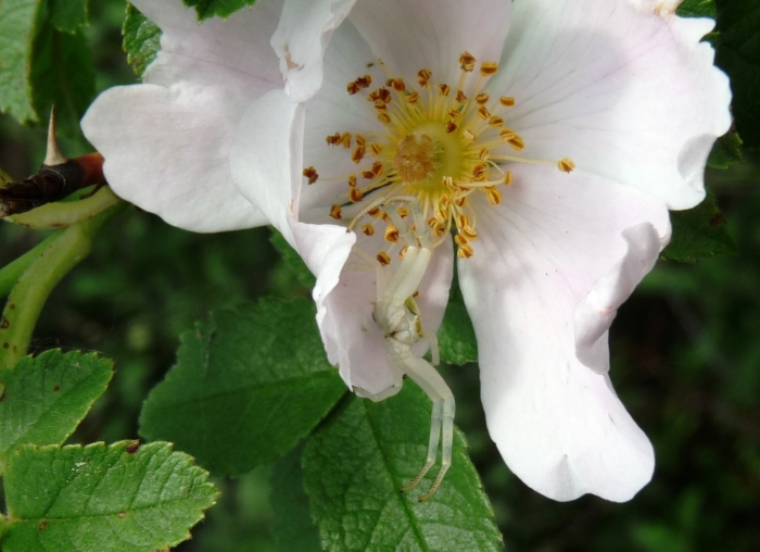 Virágokon áll lesben a fehér karolópók nevű faj is. Neve ellenére nemcsak fehér színváltozata van, gyakran látható citromsárga egyed a hasonló színű virágokon. Ne a színéről, inkább az alakjáról és a méretéről igyekezzünk felismerni! Mérete 1 cm alatti, de azért jól látható szabad szemmel, ha elég közelről (és lustaságunkat félretéve alulról is) nézegetünk réti virágokat. A pókocska potroha, más néven utóteste, két csúcsban végződik, így felülről nézve háromszög alakú. Ha éppen zsákmányt ejtett, akkor az két szempontból is előnyös számunkra: egyrészt a mozdulatlan, természetellenes pózban lévő rovart könnyebben észrevesszük, mint magát a pókot, másrészt a pók is el van foglalva, kevésbé menekül előlünk. Máskor hamar észreveszi, ha közel hajolunk, s gyorsan fedezéket keres a szirmok között vagy egy ernyős virág alsó felén. Van egy másik jellegzetessége is ennek a fajnak, de én azt igazán a közeli fotókon látom csak, lehet, hogy fiatalabb természetjárók szabad szemmel is. A fehér karolópók sok szeme két sorban helyezkedik el a fejtorán, s a két sor között van egy kiugró perem. Ennek a párkánynak a két széle kiáll, olyan, mintha ott lenne a két szeme, mint pl. egy ráknak. De ez megtévesztő, mert nem két összetett szeme van (mint a rovaroknak és rákoknak), hanem nyolc pontszeme, s nem a peremen, hanem alatta és fölötte helyezkednek el. (A pókok szemeinek száma 2 és 8 között mozog).