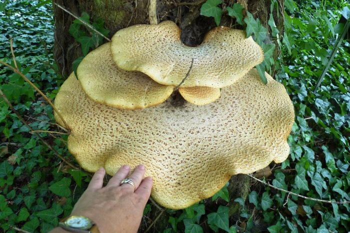 Az egyik fatörzsön hatalmas pisztricgombát láttam. Igazán impozáns méretű darab volt! Ez a fán élősködő, s azt idővel el is pusztító gomba fiatalon ehető, idősen rágós húsú. Persze ez nem téma egy arborétumban, hiszen itt semmit se szabad leszedni.
