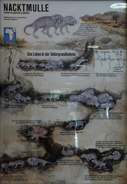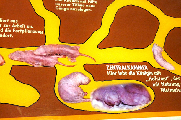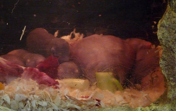 Az egyik „nagy durranás” rögtön a bejárat belső oldalán fogad minket. Ezt a fajt még sosem láttam állatkertben! Nevük: csupasz turkálók (földikutyák). Az a legnagyobb különlegességük, hogy az egyedüli államalkotó emlősök (az embert leszámítva). A csapat egyetlen szaporodó nősténye a királynő, aki hormonokkal szabályozza a közösséget, megakadályozva a többiek szaporodását. Vannak dolgozók, akik kiássák a föld alatti járatokat (sosem jönnek a felszínre) és összegyűjtik a növényi részekből álló táplálékot. A hímek szerepe a párzás és a királynő megtermékenyítése. A kölykök szopnak, majd a felnőttek székletét eszik, megszerezve ezzel az előemésztett táplálékot és a bélflóra baktériumait. A földalatti járatok rendszerében külön helye van a királynő és kölykei hálószobájának, az éléskamrának, sőt a WC-nek is. Egyszóval, nagy tisztelettel néztem a nevezetes élőlényeket. Nem lehet mondani, hogy a szépségükkel kápráztatnák el a látogatókat! Ritka rusnya állatkák! A rágcsálók általában helyesek, szőrösek, simogatásra csábítók. A csupasz turkálók rózsaszín, dudoros teste, két hatalmas metszőfoga kevés esztétikai élményt nyújt. Ennek ellenére igazán érdekesek!