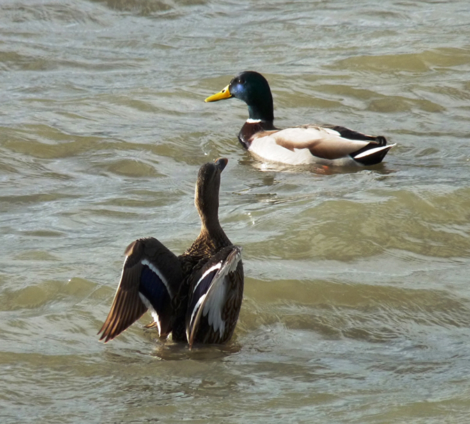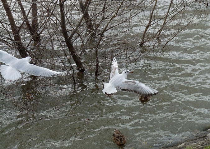A révnél hivatalosan véget ért a program, sokan elbúcsúztak. Mi néhányan be akartuk várni a többi csapatot, így időtöltésképpen a dankasirályokat figyeltük, majd kaptak némi kóstolót Csabáék uzsonnájából. Lenyűgöző figyelni a repülésvirtuóz sirályokat vadászat közben! Végülis a sonkás zsemle megszerzése is egyfajta vadászat, tehát bemutatták az összes hirtelen fordulást, fékezést, irányváltást, ami csak szerepel a repertoárjukban. A lepattanóra a tőkés récék startoltak rá. Alig vettük észre, hogy az egyik „tőkés” nem olyan, mint a többi, hiszen egy csörgőréce. Még a nap is kisütött, hogy jobban látsszon a fémesen kéken vagy zölden megcsillanó folt a fején. Ezt a búcsúajándékot kaptuk a Dunától.