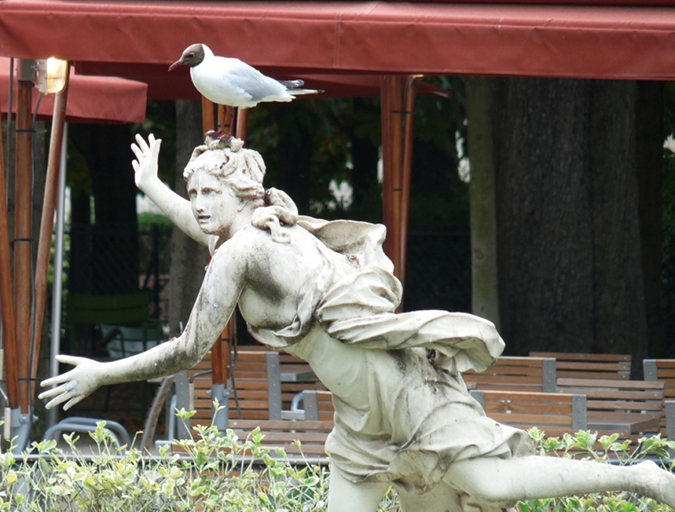 Mi, verebek is csapatosan járunk. Így biztonságosabb, s az idősebbek persze a kertet is jobban ismerik. Bevallok valamit: tegnap Pierrel, egyik testvéremmel elszakadtunk a csapattól, hogy kicsit körülnézzünk. Ez szigorúan tilos! De mi gyorsan átrepültünk a varjúveszélyes gyep fölött. A fák között aztán megpihentünk, s megvártuk, míg kicsit lassabban ver a szívünk. Megcsináltuk! Itt már nem érhet baj, kezdődhet a leskelődés. Elrepültünk egy kis tavacska mellé, a sűrű bokrok közé. Az emberek békésen üldögéltek a padokon, s ettek. A rendes emberek közé tartoztak, mert morzsákat szórtak a földre. Mi nem mertünk a földre szállni, de a galambok lelkesen szedegettek.