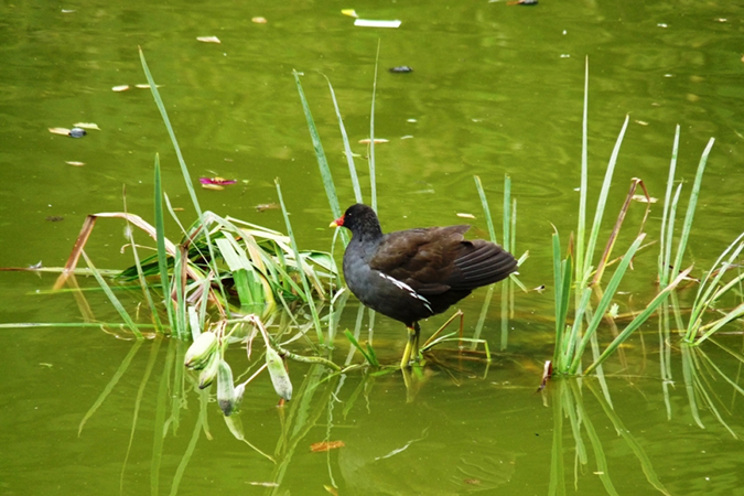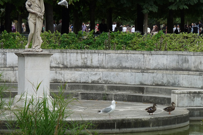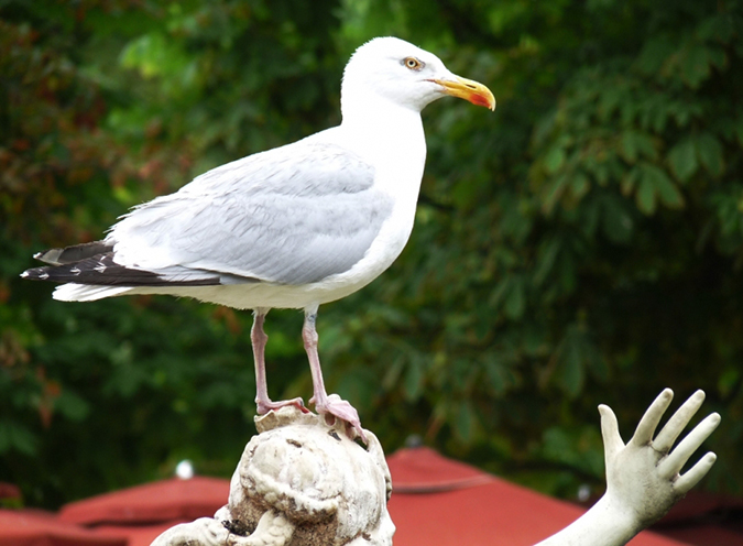 A tóban egy kőember állt nevetségesen széttárt karokkal, mintha repülni akarna. Hát ezt bizony nem így kell csinálni! Ha ő nem is tudott felrepülni, a madaraknak jó kilátópontként szolgált. Most is állt rajta egy feketefejű fehér madár, Pierre szerint dankasirály. Én is láttam már ilyet, ügyesen fordul a levegőben, azt meg kell hagyni. Amint ő elrepült, egy örvös galamb foglalta el a helyét. Szeretem az örvösök szép, visszafogott színeit. Nem is kell egy madárnak hivalkodónak lennie. Például mire jó a sirálynak, hogy mindenki már messziről látja? Néhány perc múlva az örvös is elrepült, s szinte azonnal megérkezett valaki a helyére. Jaj nekem, de megijedtem! Ekkora csőrt még nem láttam! Talán egyszerre be tudna kapni engem, ha akarna! A hatalmas csőr sárga volt egy piros pöttyel a végén, az egész madár a dankára hasonlított, csak sokkal nagyobb kiadásban. A legrosszabb azonban a szeme volt: jéghideg, hófehér tekintettel nézett körül. Egy pillanatig azt hittem, engem néz, de nem. Egy könnyed mozdulattal leszállt a vízre és fürdeni kezdett. Így már nem is látszott annyira félelmetesnek. Főleg akkor nem, amikor legnagyobb csodálkozásomra elindult feléje egy kis fekete vízityúk, s megtámadta a nála ötször nagyobb madarat. Mit akar ez? Öngyilkos akar lenni? De nem, csak a közelben mászkáló fiókáját védte. A pici madár agresszív támadása felkészületlenül érhette a sirályt, mert kitért előle, sőt hamar elege lett a sorozatos zaklatásból, s kimenekült a partra. Úgy nevettünk a testvéremmel, hogy majd leestünk az ágról! „Láttad ezt?” – kérdezgettük. Éljen! A kicsi kikergette a vízből a levegő királyát! Ezt el sem fogják hinni a szüleink, ha elmeséljük… Ajjaj! A szüleink! A csapat! Sürgősen vissza kellene menni. Már biztosan felforgatták a kertet miattunk.