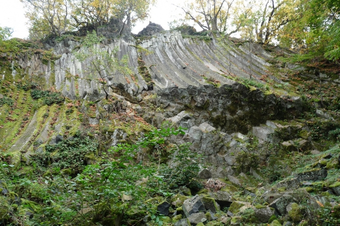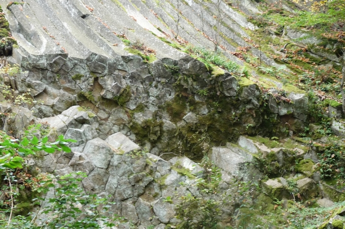 Az andezit egy 18-19 millió évvel ezelőtti vulkáni működésnek köszönhető. A láva egy része kőzetrepedésekben rekedt, s hűlt ki (ezeket hívjuk teléreknek). A kihűlés során zsugorodott az anyag, ennek köszönhető az oszlopos elválás. (Az oszlopos megjelenés egyébként a bazaltra jellemző, andezitben nagyon ritka!) Az oszlopok 5 vagy 6 szögűek, s 8-10 méter hosszúak. Most azért láthatjuk őket a felszínen, mert az 1980-as évekig bányászták itt az andezitet (Holczer-bánya). Ez az andezit anyagában is nagyon szép, csiszolható, így sírkőobeliszkek készítésére is alkalmas volt.