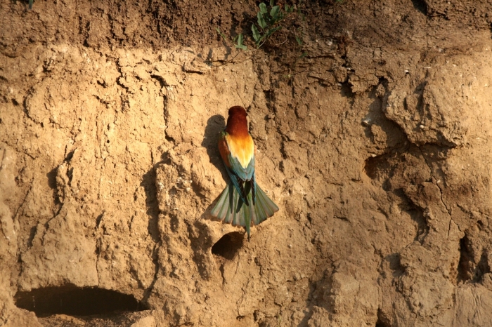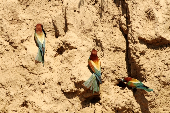 Május lévén gyakran láttuk, hogy a madarak a löszfalban mélyítik-javítják költőüregeiket. Az üregekből mi csak a bejárati nyílást látjuk, de akár egy vagy két méter hosszú is lehet egy-egy ilyen járat. Van rajta munka elég. Vicces volt, amikor a pár egyik tagja az ásáson dolgozott, s a párja is odarepült, hogy mutassa buzgóságát, de jutalmul csak egy nagy adag port kapott a fejére. Ilyenkor általában megrázta magát és arrébbrepült, mielőtt tetőtől talpig belepte volna csodás tollait a kosz. De olyat is láttunk, hogy egyszerre két madár préselte be magát a nyíláson. Hogy ilyenkor hogy tudtak dolgozni, az rejtély!