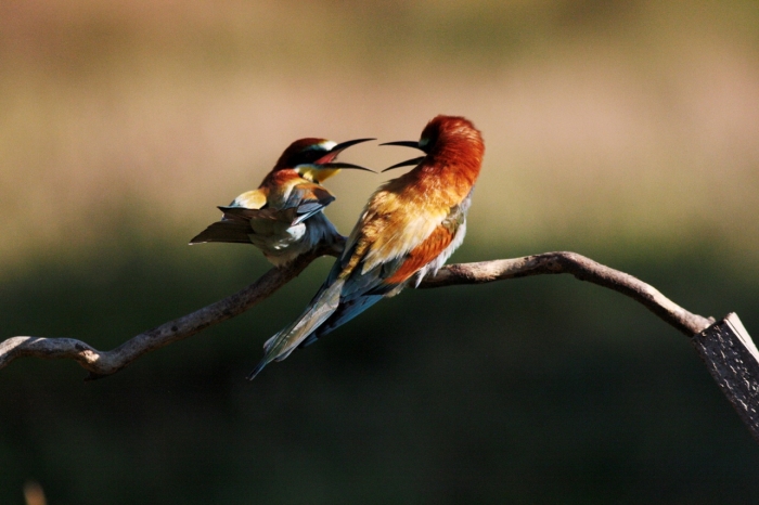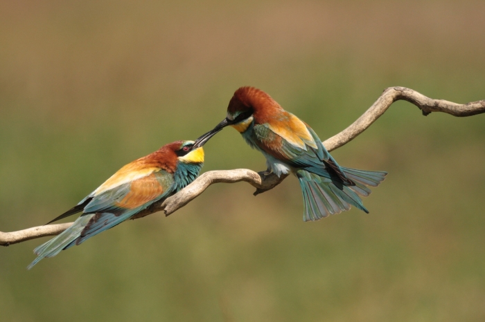 Más alkalommal azonban semmiféle ajándék nem előzte meg a párzást, ami így kívülről nézve minden előzmény nélkül kezdődött. Biztos vagyok benne, hogy számos jelet váltott előtte a pár, ami biztosította őket a kölcsönös vonzalomról, de sajnos ezek a jelek számunkra rejtve maradtak. Maga a párzás azonban nagyon látványos két ilyen drágakő színezetű madár esetében. A hím széttett szárnyakkal egyensúlyoz, míg a tojó magasra emeli vagy elforgatja a farktollait. Előfordult, hogy nem egy ágon történt a szerelmi légyott, hanem a löszfal peremén, s innen a nagy szextornában lezuhant a pár. Lehet, hogy nem illik, de nagyot nevettünk rajtuk. Kézenfekvő volt a párhuzam a „legjobbkor” leszakadó ággyal. (Persze a lezuhanás nem veszélyes egy kiválóan repülő madár esetében.)