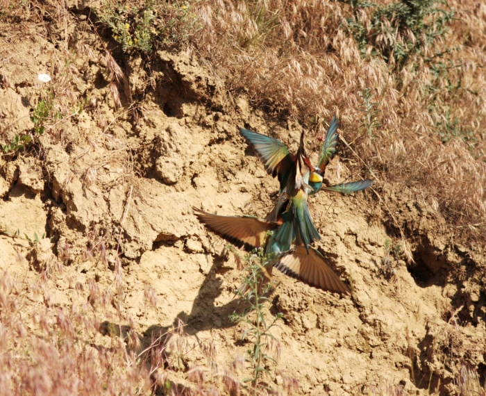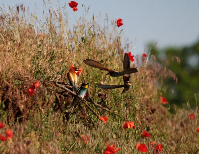 A hosszú löszfalon nekem legjobban az a rész tetszett, ahol kevésbé volt meredek a fal, s részben benőtte a növényzet. A piros pipacsok között fantasztikusan mutattak a türkizkék-sárga (és még vagy százféle színárnyalatban pompázó) madarak. Tudom, hogy számukra nem ez az ideális fészkelőhely, mert jobban szeretik a nyílt, meredek falakat, ahová ők könnyen berepülnek, míg a ragadozók nehezen érik el. De a meredek részen nagy volt a konkurencia, s néhányan a pipacsost választották. Köztük is akadt konfliktus bőven, harcolniuk kellett a megszerzett helyekért.