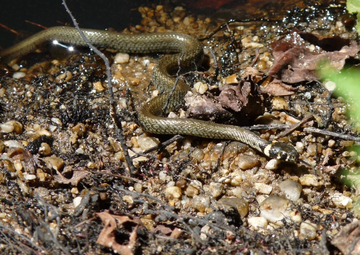 Vízisikló, hátán két világos csíkkal.