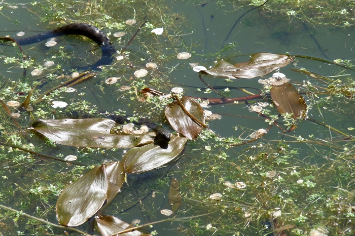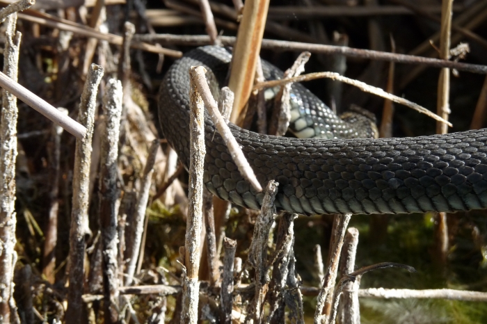 A vízisikló feje tetején a szürke folt egy pikkely, amit nem sikerült levedleni az előző vedléskor.