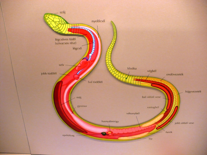 Kevésbé ismert, hogy milyen a kígyók belső felépítése. Ezt tanulmányozhatod azon a fotón, melyet a Fővárosi Állatkert Mérgesházában készítettem. A páros szerveik egyike elcsökevényesedett (pl. a bal tüdőfél). Mi lehet ennek az oka? (Ötletek a cikk alján.) Alul találjuk a kloakát, az egyetlen kivezető testnyílást (a végbél, a húgycső és a nemi szervek kivezető nyílása egyben), a kígyó további részét nevezzük faroknak. A siklók farka hosszú, keskeny, a viperáké rövid. Két viperafaj hazánkban is él: a rákosi és a keresztes vipera.
