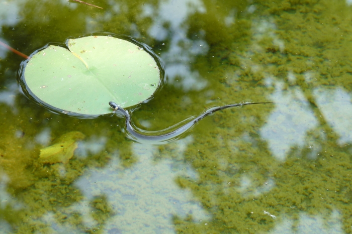 Két fiatal, de különböző korú vízisikló egy erdei pocsolyában.