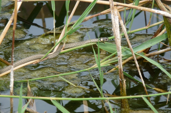 Vizekben és vízpartokon két fajjal bárki összefuthat: a vízisiklóval és a kockás siklóval. Az emberek ez utóbbit kevésbé ismerik, ezért őt is „levízisiklózzák”. A legtöbb példányt könnyű felismerni: a vízisikló feje mögött mindkét oldalon egy-egy sárga (vagy narancssárga), nagyon feltűnő, félhold alakú folt van. Mivel gyakran úszik úgy, hogy csak a fejét tartja ki a vízből, ez elég messziről látszik. A testének színezete már igen változatos lehet. A képeken is láthatsz zöldesszürke alapszínen apró fekete mintást, olyat, aminek két világos csík húzódik végig a testén, sőt szinte teljesen feketét is. A vízisikló nem csak nagy állóvizek környékén él meg. Én találkoztam már frissen kikelt példányokkal erdei pocsolyában, kiszáradóban lévő patakban, sőt a Kiskunság homokjában is. Ez utóbbi élőhely csapadékos években sekély tavakkal tarkázott, de a vízisiklók azt is kibírják, ha több évig nincs tó a közelükben. Ilyenkor béka helyett sáskákat fognak.