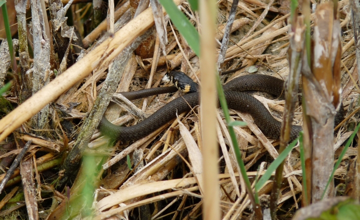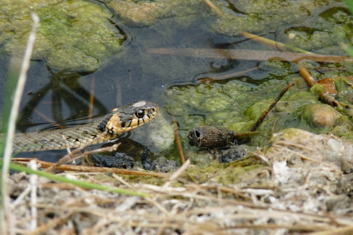 Apró mintás vízisikló. Fején jól látszik a jellegzetes, sárga folt.