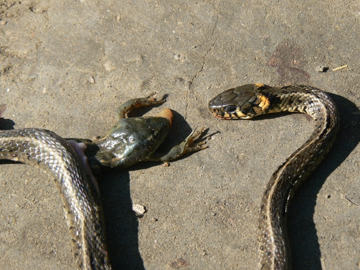 Kicsit ijesztő kép, de ez a valóság: autó ütötte el a vízisiklót, s ezért bukkant ki belőle a legutoljára elfogyasztott béka.
