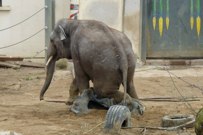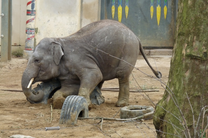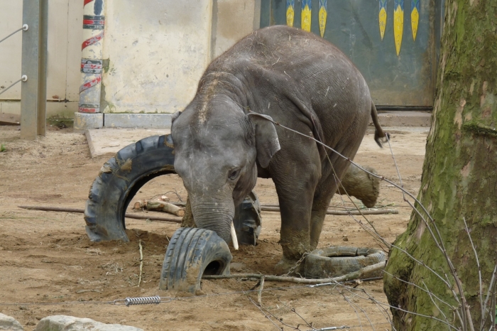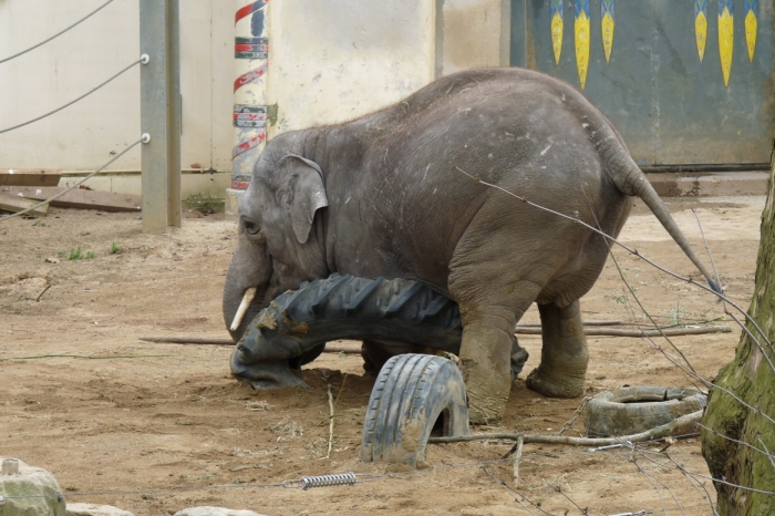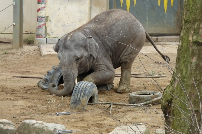 Amíg figyeltem a kiselefántokat, az ingergazdag kifutóban minden játékszerrel kreatívan játszottak. Főleg az tetszett nekem, ahogy egyikük egy nagy autógumival szórakozott. Minden irányból hajlítgatta, ráült, rálépett, fejével lenyomta a földig, ráfeküdt! Mint egy igazi kisgyerek!