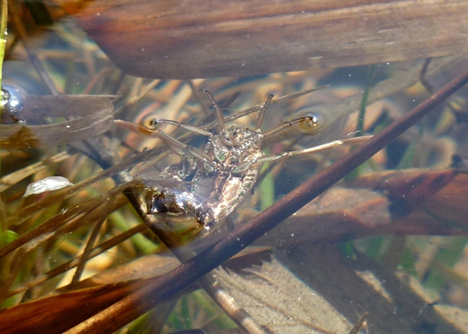 A vízben újabb mozgás vonta magára a figyelmemet. A fura, szakaszosan gyors megiramodás, majd megállás a hanyattúszó poloskára jellemző. Végül több példányt is láttam egy fél óra alatt. Ha nem mozdul, szinte észrevehetetlen, mert ügyesen rejtőzködik, pl. levelek alatt. Időnként azonban fel kell jönnie a víz felszínére levegőt venni, hiszen rovar, tehát légköri levegővel lélegzik. Ilyenkor lehet jól megfigyelni. Furcsa, hiszen a hasát látjuk (tényleg a hátára fordulva úszik), még a lábára ragadt légbuborékok is látszanak. Alulról szinte kidudorítja a vízfelszínt, a felületi feszültséget tehát nemcsak felülről benyomva lehet használni (mint a molnárpoloska), hanem alulról is. Lásd a képen!