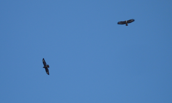 A sok lefelé nézegetés után arra kaptam fel a fejem, hogy a már órák óta a távolból hallott ölyv-vijjogás egyre közelebbről szól. Meg is láttam nemsokára a három egerészölyvet, amint a tó felett megjelentek. Viszonylag alacsonyról, kőrözve emelkedtek egyre feljebb. Közben be nem állt a csőrük, folyton vijjogtak. A nap során még többször volt alkalmam megfigyelni őket, s hangjuk végigkísérte ezt a szép szombati kirándulást.