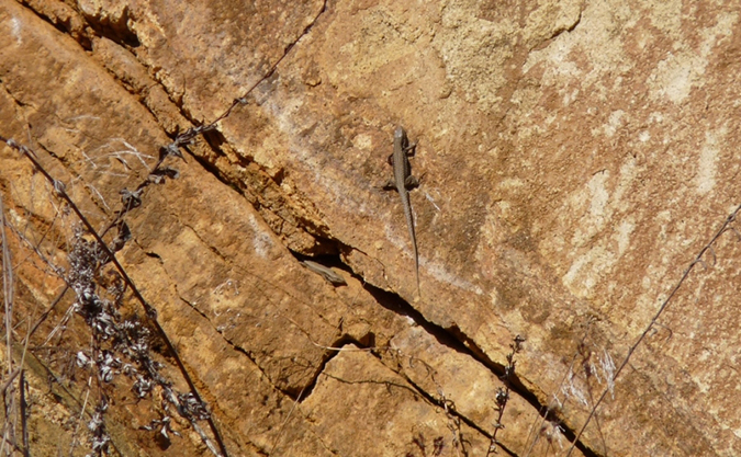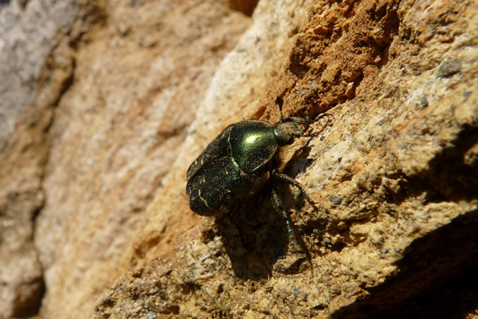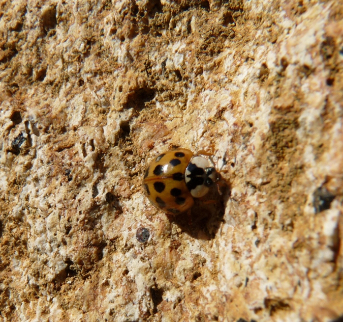 A tótól nem messze egy andezitbánya található, ami a kiírás szerint magánterület és kísérő nélkül nem látogatható, de őszintén szólva ezt senki nem veszi komolyan. Jelenleg nem folyik művelés, s ha nem akarjuk szánt szándékkal kitörni a nyakunkat azzal, hogy felkapaszkodunk a meredek falakra, nem fenyeget minket semmilyen veszély. Arra voltam kíváncsi, hogy a felmelegedő sziklafal milyen állatoknak nyújt most otthont. S nem kellett csalódnom! Míg a tóparti megszokott gyík-helyeken még nem volt semmi mozgás, itt bizony már felébredtek a fali gyíkok. Repedéstől repedésig futkároztak a falon. Egyes helyeket közelről szemügyre véve frissen ébredt, még kissé kótyagosnak látszó rovarokkal találkoztam. Egy rózsabogár lassan mászott felfelé a sziklákon, a kőpor miatt alig látszott egyébként fénylő aranyos zöld páncélja. Kicsit távolabb egy harlekin katica mozgott, jól beleolvadva a kőpor színébe. Tudom, hogy nem őshonos, tájidegen faj nálunk, de nem vitt rá a lélek, hogy elpusztítsam. Tavasz van, az élet kezdete, én ugyan nem bántom. Ha az a sorsa, majd megeszi egy ragadozó (bár katicaevésre kevesen szánják rá magukat, a védekezésül termelt váladék nem teszi vonzó fogássá ezeket a bogarakat).