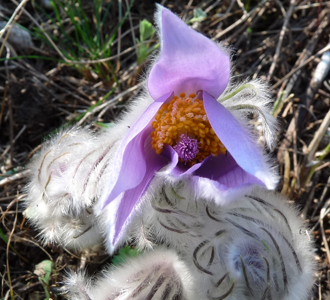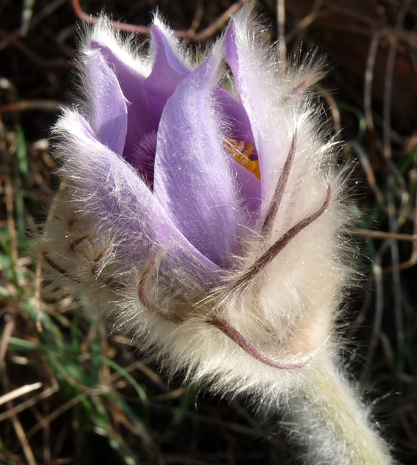 A 6 lila szirom, köztük az élénksárga porzókkal igen látványos. Sok nektárt termel a virág, vonzza a méheket és más rovarokat, akik a lakomáért cserébe elvégzik a beporzást. A szőrök a hidegtől védik a korán virágzó növényt.