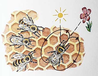 A feromonokkal való kémiai szabályozásnál jóval híresebb az a mód, ahogy a felderítő méhek (gyűjtéssel foglalkozó dolgozók) közlik a többiekkel a táplálék helyét. Ez a kommunikáció a méhek tánca, melynek felderítéséért 1973-ban Nobel-díjat kapott Karl von Frisch, osztrák etológus. Ő először a méhek színlátását derítette fel zseniálisan egyszerű kísérleteivel. A méhek számára cukros vizet helyezett ki ausztriai kertjében. A tálka alá színes kartont tett, köré a szürke különböző árnyalatait. Azt figyelte, hogy ha összekeveri a kartonlapok sorrendjét és megvonja a cukros vizet, vajon a megszokott színű lapon keresgélnek-e a méhek. Így derült ki, hogy jól látják a kéket, de a piros lapot nem tudják megkülönböztetni a szürkéktől. A kísérletsorozat alatt azonban feltűnt Frischnek, hogy az első méheket, akik felfedezték az új táplálékforrást, nagyon gyorsan és céltudatosan követik a többiek. Feltételezte, hogy a visszatérő felderítő közli valahogy a társaival, hogy mit talált. A szomszéd méhész engedélyével egyes kaptárakat üvegfalúvá épített át, valamint a táplálékra elsőnek érkező méheket megjelölte egy festékpöttyel a hátukon. Így a visszatérő méh viselkedését jól meg tudta figyelni. Látta, hogy különös, szabályos táncot jár a felderítő méh a lépen, melyet a többiek nagy figyelemmel követnek. Közel jönnek és tapogatva is ellenőrzik a tánc minden mozzanatát (a kaptár belsejében eredetileg sötét van). Hosszas kísérletsorozattal Karl von Frisch megfejtette a jeleket. A közel nyolcas alakú tánc hosszú, egyenes szakaszán a méh rezegteti a potrohát, ez jellegzetes hangot ad. Az egyenes szakasznak a függőlegessel bezárt szöge megfelel a lelőhelynek a Nap állásával bezárt szögével. (Ha pont a Nap irányába kell repülni, akkor függőlegesen felfelé táncol a lépen.) Felhős időben is repülnek, ekkor a szűrt fény polarizált (csak egy irányba rezgő) sugaraihoz igazítják a táncukat. Az egyenes szakasz hossza arányos a távolsággal. A felderítő annál kitartóbban táncol, minél több táplálékot talált, így több társát készteti elindulásra. Az ennivaló minőségét egyszerűen közli: kóstolót hoz belőle. Hát nem zseniális?