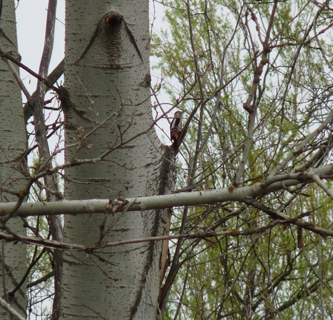 Ezen a szakaszon láttuk a túra első harkályát, a balkáni fakopáncsot. Méretében ugyanakkora, mint a nagy fakopáncs, csak a színezetében van egy kis különbség. Mint a neve is mutatja, a Balkán-félsziget felől terjedt el hazánkban, kezdetben kereszteződött is az itteni rokonaival, de mára elég hím és tojó él nálunk, hogy fajon belül alkossanak párokat. Út közben több olyan korhadt fa került a szemünk elé, amit a harkályok rendesen átkutattak. Sok finom falatot találhattak bennük, ha ennyi lyukat fúrtak rá! Ezen a napon láttunk még zöld küllőt, ami szintén egy harkályfaj. Elég magasan állt egy ágvillában, lábaival kapaszkodva és erős farktollaira támaszkodva. Úgy nézett ki, mint aki beszorult, ami persze butuska feltételezés volt tőlünk, de mindenesetre alig mozdult.