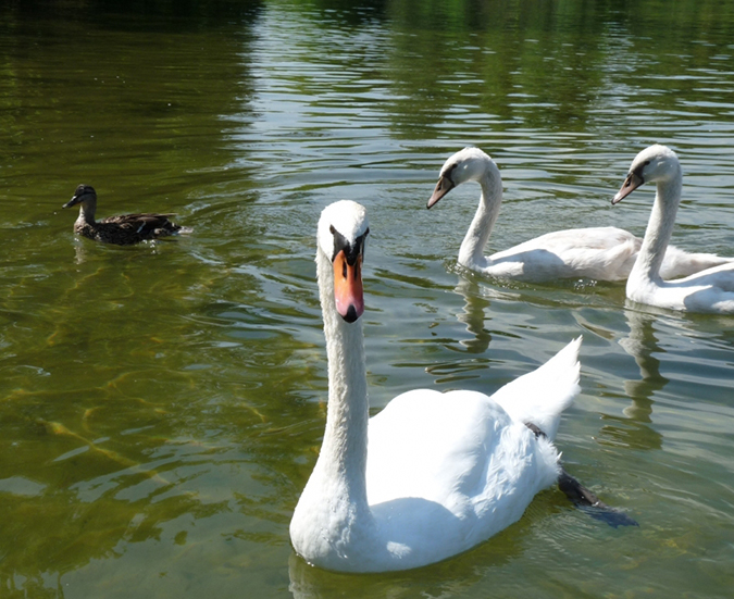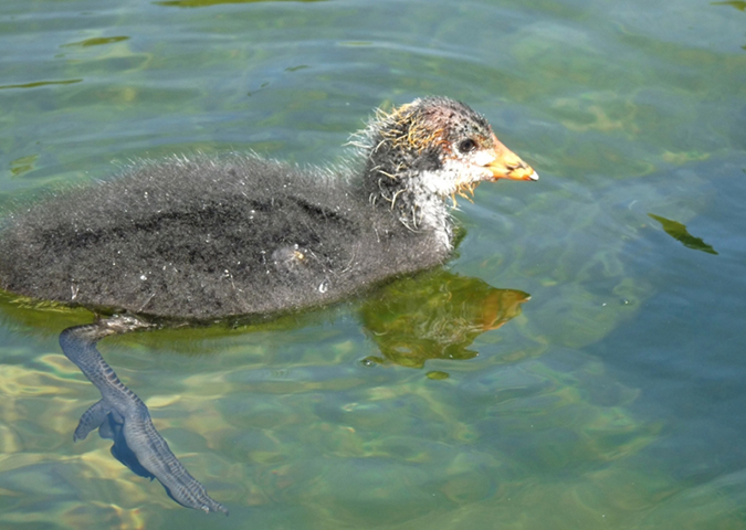 A tó egy nyugalmas szegletében már messziről fehérlett egy hattyúcsalád. Jól tettem, hogy hoztam magammal egy csomag süteményt, így volt mivel megkínálni őket. A felnőttek közel jöttek, de nem vették el kézből a falatokat, míg a fiatalok igen. A fiókák már fehér tollruhában úszkáltak (kiskorukban „rút kiskacsák” szürke tollakkal), de kisebbek voltak a szüleiknél és a csőrük is halványabb színezetű. Míg rájuk figyeltem, megérkeztek a tó további vízimadarai, az elmaradhatatlan tőkés récék és nagy örömömre egy szárcsamama a fiókáival. Mind turbó fokozaton, teljes erőből evezve érkeztek, így nagyon szembetűnő volt a sebességbeli különbség. A vadkacsák sokkal gyorsabban haladtak a szárcsánál. Ez persze nem meglepő, ha ismerjük a lábukat: a vadkacsa úszóhártyás lába hatékony evező, míg a szárcsa különálló, hosszú lábujjain csak kisebb lebenyek növelik a felületet (lásd a fotón). Ezen a lábszerkezeten viszont nagyon jól eloszlik a testsúly, ha a madár vízinövények levelein akar lépegetni.