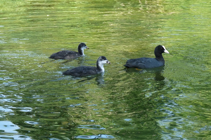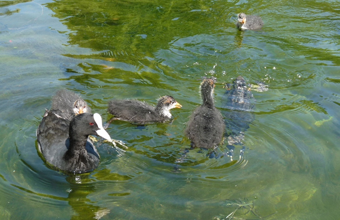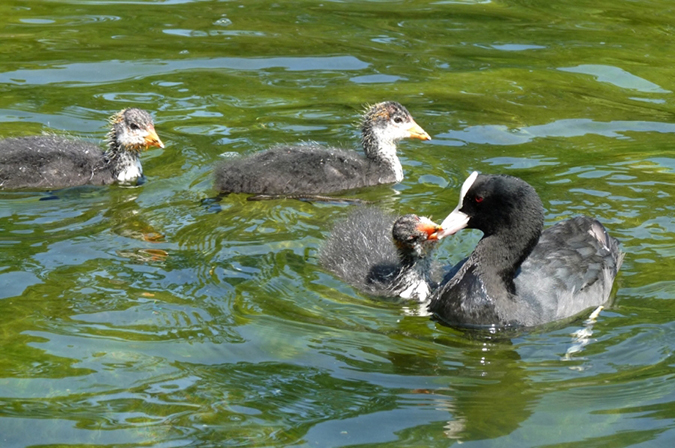 A piskótát azonban egyformán kedvelték. A hattyúk rendre tisztázták, hogy ki eszik először (természetesen ők), de elég volt egy kis fenyegetés, hogy a kisebb madarak tisztes távolba húzódjanak. Amint a hattyúk jóllaktak, a szárcsamama is közelebb merészkedett. Érdekes volt megfigyelni, hogy rendre ő szedegette össze a falatokat a vízből, de mindig odafordult velük a legközelebbi fiókához és csőrből csőrbe átadta neki. A kicsik pedig hangosan sipákoltak újabb falatért. Ők nem olvasták a biológia tankönyveket, amikből pedig világosan megtudható, hogy fészekhagyó madarak, akiket csak vezetnek és védenek a szüleik, de nem etetik őket. Hát ezeket bizony etették. Néha láttam, amint a fiókák is felcsippentettek egy-egy morzsát a vízből, de leginkább csak követték anyjukat és kunyeráltak. Közelről jól látszott, hogy ezek az „édes csöppségek” bizony csak az anyjuk szemében lehetnek szépek, mert ilyen fiatal korukban valami hihetetlenül rusnyák. Fejükön, ahol éppen nem kopaszak, égnek áll a szürke és narancssárga, szőrnek látszó toll. Ebből a komikus külsőből aztán egy elegáns, fekete tollú, fehér csőrű, piros szemű szépség lesz majd, csak ki kell várni.