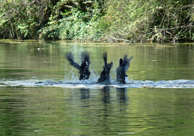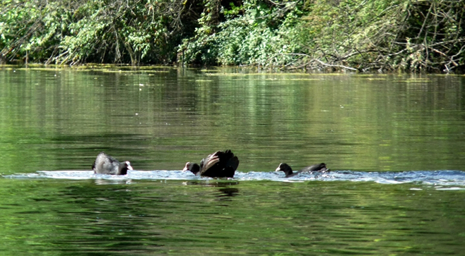 A mamával egy időben vettem észre, hogy tőlünk távolabb, a tóban valami csetepaté zajlik. Két madár vadul fröcskölte a vizet. Az eddig a csónak mellett békésen eszegető tojó azonnal maximális sebességre kapcsolt: szárnyával is segítve magát szinte futott a vízen, hogy mielőbb a helyszínre érjen. Ott ugyanis az ő férje verekedett! Mint később beigazolódott számomra, a két hím a területeik határvonalán csapott össze. Mindkettő harci üzemmódba helyezte magát: tollaikat felborzolták, szárnyukat hátul a testük fölé emelték, hogy minél nagyobbnak látszanak. Nem puszta fenyegetés, hanem valódi harc folyt, amelybe azonnal beszállt a tojó is, amint megérkezett. Csak úgy fröcskölt körülöttük a víz! Azt nem láttam, hogy a csípés vagy a rúgás technikáját alkalmazták-e többször. Végül győzött a túlerő, a betolakodó hím visszavonult, a győztesek nem üldözték. A tojó visszaúszott elhagyott fiókáihoz, a hím kiállt egy faágra tollászkodni. Úgy látszik, a harcban összeborzolódott ruházata azonnali rendbehozatalra szorult. Sérülés egyik madáron sem látszott.