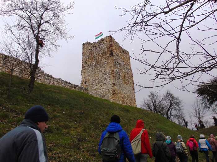 Csapatunk a falu szép házai és gondozott kertjei között felsétált Bánd másik látványosságához, az Essegvárhoz. Az „esseg” szó eredete valószínűleg a környéken gyakran használt földrajzi név, a „szeg”, ami halmot, dombot jelentett. Ezt a nevet aztán a várat birtokló egyik nemzetség is felvette. A vár részletes történetével megismerkedhetünk a tájékoztató tábla segítségével. A ma csak romjaiban látható építmény megmaradt részének tetejére meredek, de biztonságos létrán mehetünk fel. Számunkra most kinyitották ezt a kaput is, így megcsodáltuk a panorámát. Akit érdekelnek a kövek, mindig nézze meg egy vár falát közelről, mert általában a környék kőzeteit találja meg benne beépítve. (Kevesen engedhették meg maguknak, hogy távolról hozassanak méregdrága építőanyagot.) Az Essegvárban a sarokkövek egy része a Balaton-felvidék permi vörös homokkövéből készült. A sárgásfehér kövek pedig részben a helyi dolomitbreccsa darabjai. Ez utóbbiak úgy jöttek létre, hogy a tengerfenéken leülepedett dolomitot a kőzetlemezek mozgása kiemelte, így lett belőlük szárazföldi terület. A későbbi mozgások újabb töréseket hoztak létre, melyek mentén a szilárd kőzettestek ismét elmozdultak egymás mellett. Ezeknek az elmozdulási síkoknak (vetőknek) mentén a kőzet erősen összetöredezett. Így keletkezett a természetes dolomit murva. Ahol így maradt, onnan most csak ki kell bányászni és máris felhasználható útalapozásra. Másutt viszont az erősen összetöredezett darabok közé forróvizes oldatok hatoltak be, s oldott ásványi anyagokat hoztak magukkal. A kovás anyag megszilárdult, s nagyon kemény kőzetté cementálta a dolomittörmeléket. Ez a dolomitbreccsa. A fotón egy olyan darabot láthatunk, amiből részben már kiperegtek a felszíni dolomit darabok, de a cementáló anyag szó szerint „sziklaszilárd”.