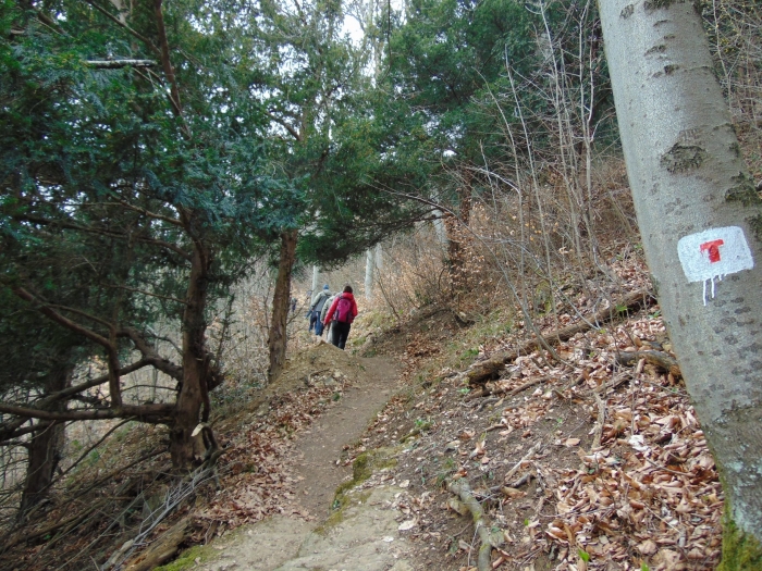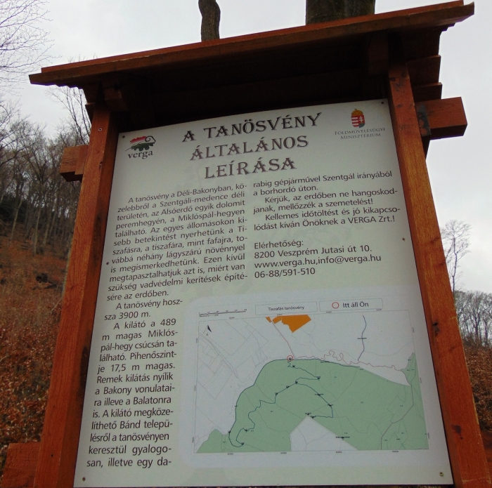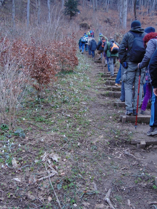 A Miklóspál-hegy meredek oldalára lépcsők és egy kanyargós ösvény vezet fel. Bizony kell az erőnlét a megmászásához! (Nehezebben mozgó érdeklődők számára van egy alternatív megoldás: a Miklóspál-hegyi kilátóhoz Szentgál felől egy szintig kocsival is fel lehet menni, s a csúcstól lefelé sétálva hamar el lehet érni felülről a tanösvényt, s bejárni annak egy lankásabb szakaszát.) Mi a meredek oldal felől kapaszkodtunk felfelé, de megérte, mert olyan hóvirágmező szegélyezte a lépcsőket, hogy alig hittünk a szemünknek. Másutt már elvirágzott a hóvirág, de itt teljes pompájában virított. Ez is mutatja, hogy ez egy kifejezetten hűvös hegyoldal, amit nagyon kedvel a tiszafa. Érdekes, hogy a később virágzó lágyszárú fajokkal a felsőbb szinteken találkoztunk. Ebből arra következtetek, hogy erősen érvényesül a mikroklíma hatása.