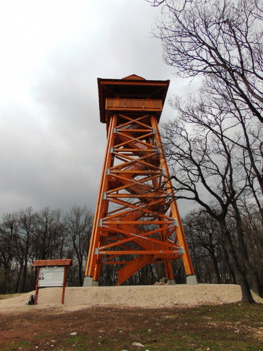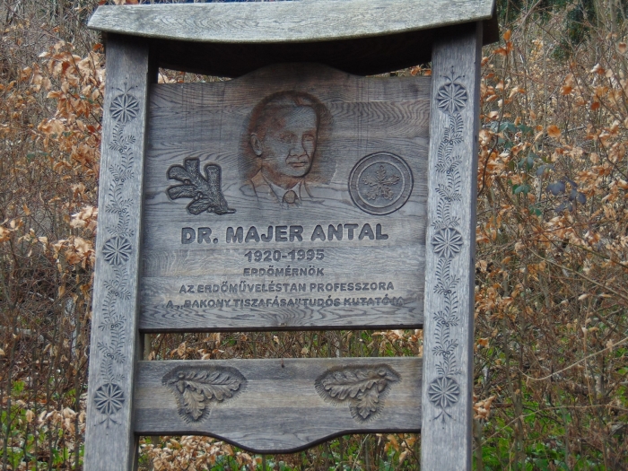 A Miklóspál-hegy csúcsa felé haladva egy kapun át elhagytuk a tanösvényt, s felkapaszkodtunk a Dr. Majer Antalról (a tiszafás első kutatójáról) elnevezett, impozáns kilátóhoz. Érdemes megmászni a több emeletnyi lépcsősort, mert szépséges a panoráma! A kilátót így márciusban egy sűrű medvehagymás veszi körül, még leszakítás nélkül is erős fokhagymaillatot árasztva.