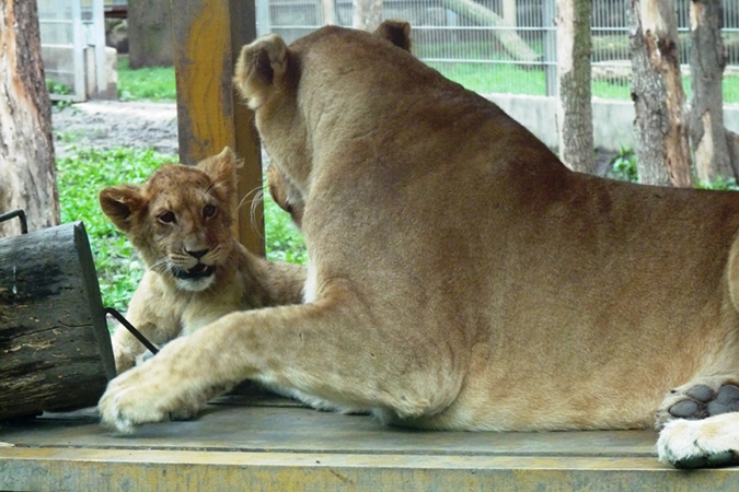 Még oroszlánokat is lehet rács nélkül figyelni! Ez a bravúros megoldás egy tavacska fölötti hídrendszer, ahonnan belátunk az oroszlánkifutóba. Itt is született kölyök, aki sajnos egyke, s nincs játszótársa. Amikor ott jártunk, az anyját gyötörte, aki elég hamar elunta ezt, s csatlakozott a többi felnőtthöz. Szegény kicsi csalódottan lehevert.