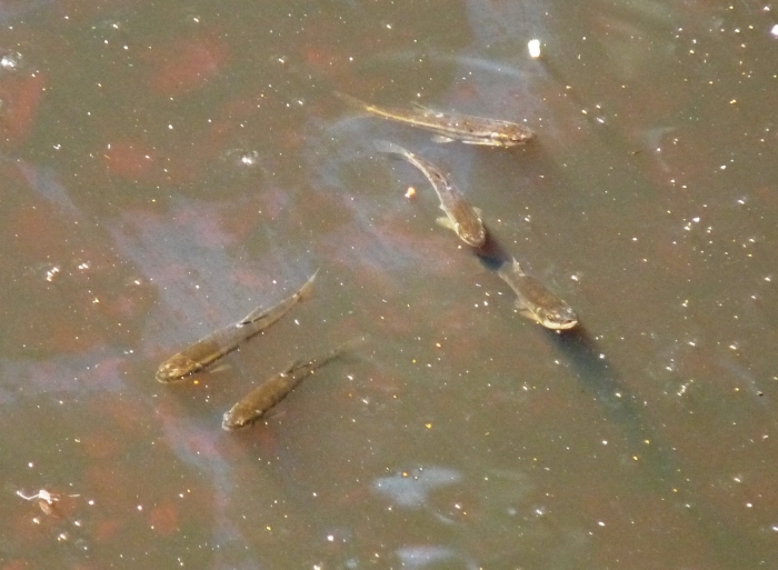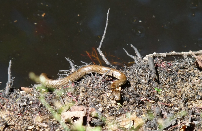 Leültem leskelődni egy nagyobb vízfolt mellé, s most sem bántam meg! Nemsokára egész rajnyi kishalat pillantottam meg. Nem vagyok a halak nagy szakértője, ezért csak itthon sikerült meghatározni őket. Fürge csellék lehettek, akik szeretnek rajban úszkálni. Mivel azt olvastam róluk, hogy kedvelik az oxigéndús patakvizet, most nem érezhették valami jól magukat a maradék víztócsában. Fel is jöttek a víz színére, s a levegőből „pipálva” pótolták a hiányzó oxigént. Mint nemsokára kiderült, más szempontból is csapdába estek. Csendben üldögéltem, s ezért észrevétlen maradtam, így egyszer csak megjelent egy vízisikló-gyerek feje a vízben, aztán nemsokára egy másik is. Egyidősek lehettek, olyan 25-30 cm hosszúak, ujjnyi vastagok. A színük azonban jelentősen különbözött, az egyik sötét, a másik inkább világosbarna színű volt. A világosnak sikerült villámgyorsan elkapnia egy halacskát, de a nyelés a víz alatt történt. A gyors mozdulatról csak egy életlen képet sikerült készítenem. Aztán mindketten kijöttek a partra, s egyikük apró rovarokra vadászgatott, a másik pedig napozott. Időnként megjelent egy gyönyörű, zöld-kék szitakötő, s ellenőrizte a terepet, aztán eltűnt. Sajnos nem szállt le egy pillanatra sem, pedig szívesen lefényképeztem volna.