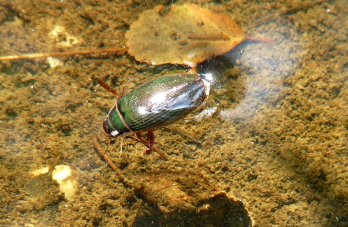 A legtöbb helyen most a sárgaszegélyű csíkbogárral találkoztam. Gyönyörű, zöld szárnyfedője csillogott a napsütésben. A szélén sárga csík fut végig, innen kapta a nevét a bogár. Ez a faj ragadozó, a víz alatt kutat apró állatok után. Érdekes volt látni, amint átvizsgálta az iszapot, feltúrta a behullott leveleket. Ha lélegzetet akart venni, akkor feltolta a „popóját”, vagyis a potroha végét a víz felszínére és ott vett levegőt. A bogaraknak légcsőrendszer (trachearendszer) hálózza be a testét, s a légzőnyílásaik a potrohon vannak. Ha elfogy az élelem, a csíkbogárnak nem kell éheznie, mert kimászik a szárazra és elrepül, hogy újabb tócsát találjon magának.