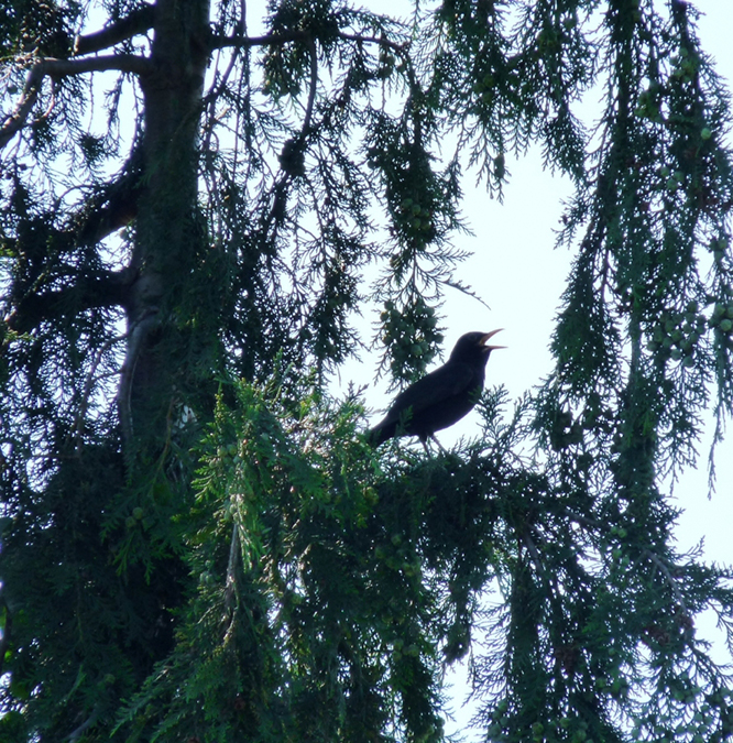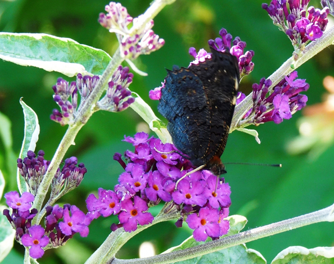 Én seregélyeket láttam a fűben keresgélni. Messziről olyanok, mintha fekete rigók lennének, de soványabbak, s közelebbről jól láthatóan pöttyösek. Szeretnek csapatosan járni. Az egyik fenyőn egy igazi fekete rigó énekelt, olyan lelkesedéssel, mintha tavasz lenne. A nyári orgona lila virágain nappali pávaszemek szívogatták a nektárt. Olyan közel engedtek magukhoz, hogy szinte belelógathattam az orrom a virágjukba (igaz, úgysem férne bele).