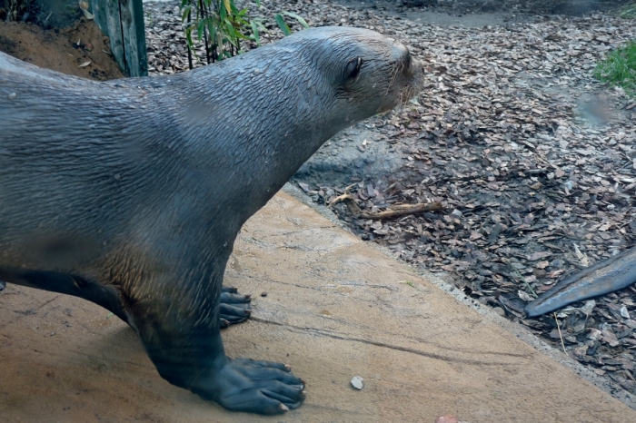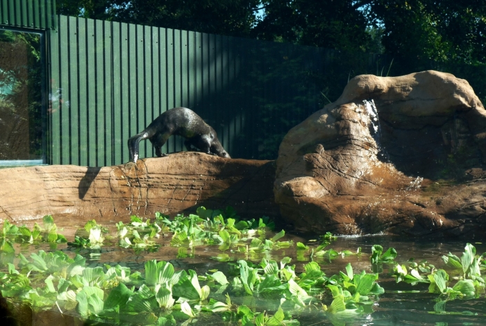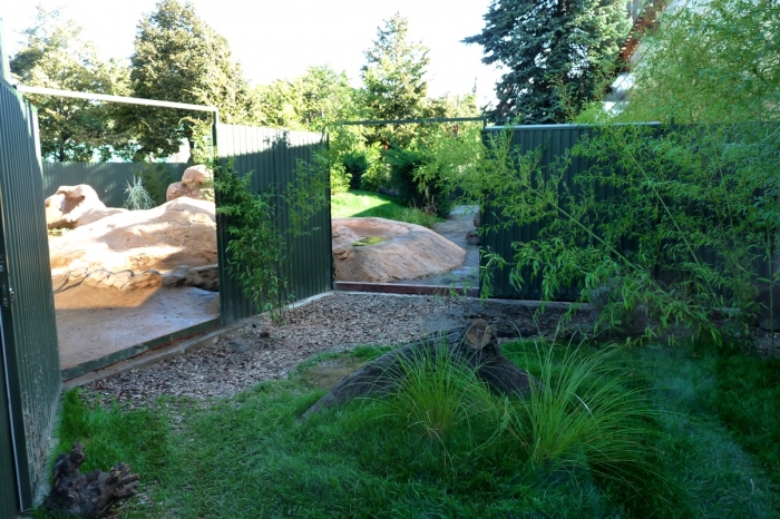 A kifutójuk a korábbi lepkekert helyén látható, kialakítása egészen új, esztétikus és részletgazdag. Van benne úszómedence, de „patak” is. A vidrák kereshetnek maguknak búvóhelyet a fatörzsek alatt, szaladgálhatnak a füvön vagy áshatnak a földes részeken. Mivel azt olvastam róluk, hogy a napozóhelyeiken ki szokták irtani a növényzetet, lehet, hogy veszélyben vannak a kifutó szép fái és bokrai? Majd meglátjuk.