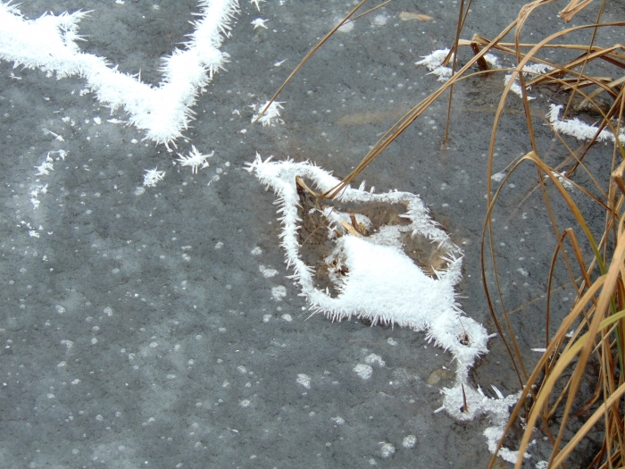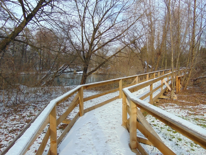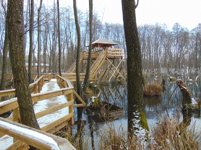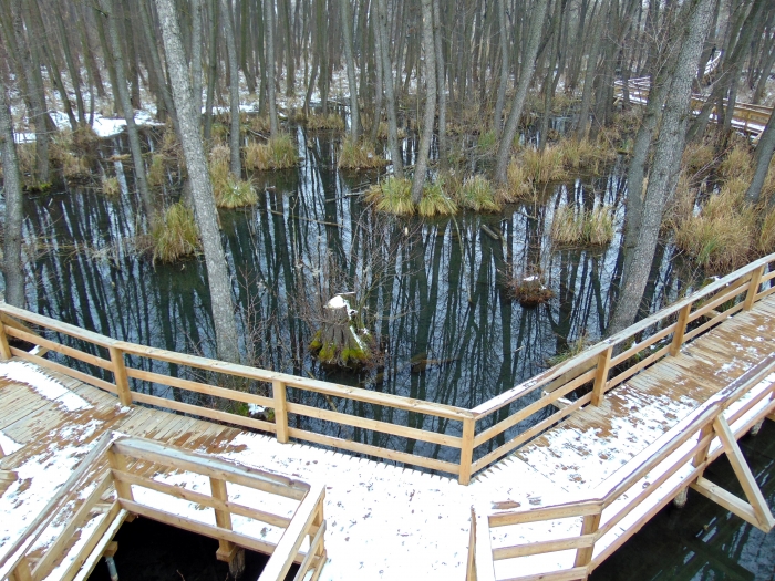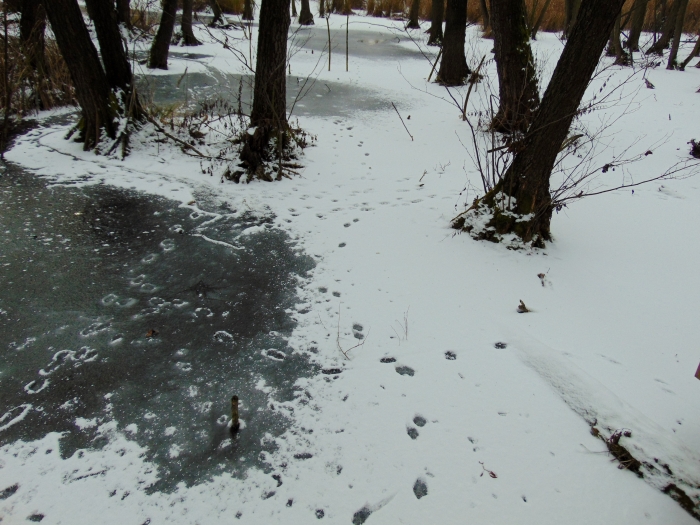 Végigsétáltam a teljes pallósoron. A feltörő forrásoktól távolabb már akadtak befagyott részek. Ezeken a lábnyomok tömegében lehetett gyönyörködni. Vidranyomokat is felfedezni véltem. Elbeszélgettem a kedves, fiatal hölggyel a pénztárban, s ő megerősítette, hogy tartózkodik vidra a területen, még a róla készült videót is megnézhettem. Arra nem gondoltam, hogy nutria is él a lápon, de a róla készített felvétel bizonyította jelenlétét. Szívesen találkoztam volna vele, de most nem mutatkozott.