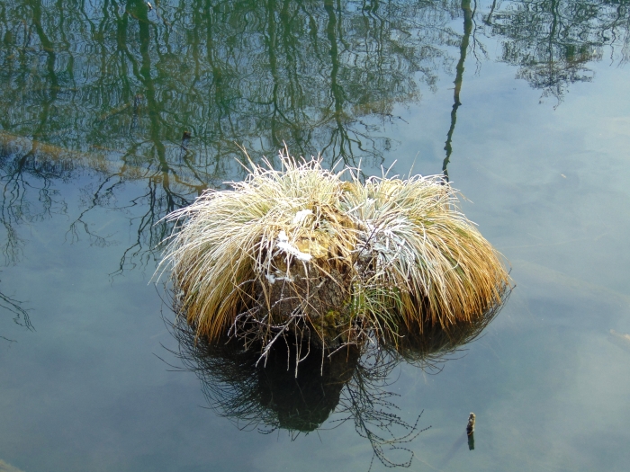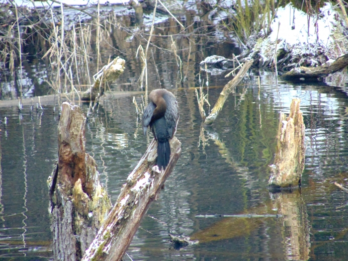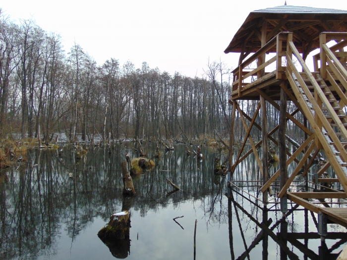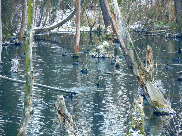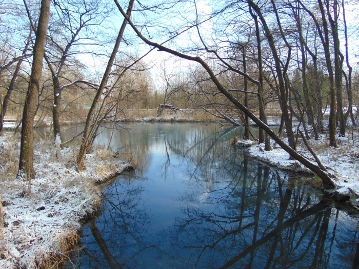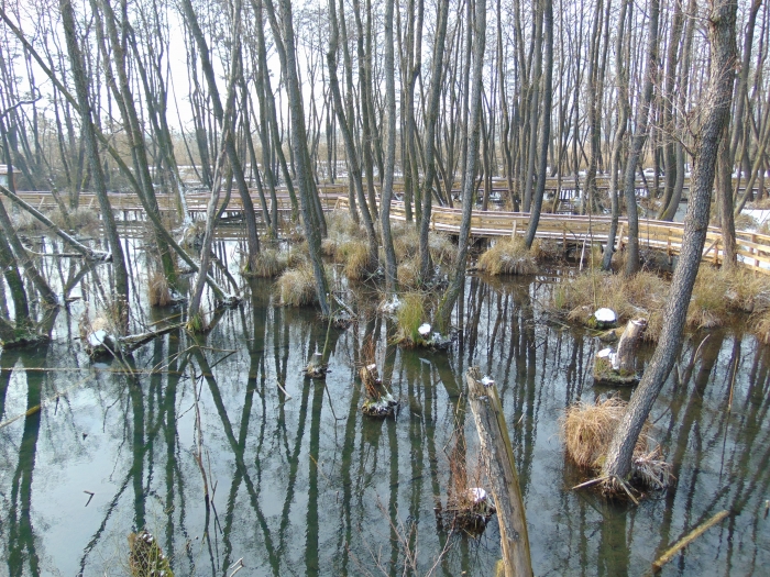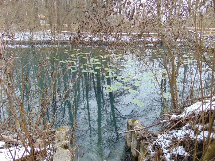 A toronyban nézelődve egyre jobban éreztem, hogy január van, mennem kellene tovább, mielőtt mindenem meggémberedik. Az egykori égeres mára vízzel borított részei mellett továbbsétálva a tó másik oldalához lehet jutni. Itt úgy törnek fel a források, hogy folyamatos bugyogásuk, buborékjaik kiválóan látszanak. Le lehet látni a fenékig. Azt reméltem, hátha meglátok egy békát vagy egy mocsári teknőst. Télen ez buta kívánságnak tűnik, de ebben a meleg vízben több példány áttelel anélkül, hogy elvermelt volna télire. Sajnos nem találkoztam velük.