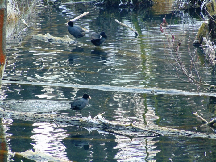 Aztán magukra vonták a figyelmemet a szárcsák, ezek a fekete tollú, fehér csőrű, elegáns madarak. Viselkedésük azonban ritkán elegáns, rendszeresen összekapnak valamin, s lelkesen kergetik egymást a vízen futva. Az izgalom azonban hamar alábbhagy, s folytatják békés merüléseiket ennivaló után kutatva. Itt a meleg vízben egy nagy csapat úszkált együtt. Amikor felmásztam a megfigyelő toronyba, kicsit eltávolodtak, de amint tartósan csendben voltam, közelebb úsztak. Köztük, de a toronytól mindig jókora távolságot tartva vízityúkok úszkáltak. Ők is sötét színűek, de csőrük piros, a csúcsán pedig sárga. Nagyon félénk madarak, amint megláttak, igyekeztek fedezékbe vonulni. Csak hosszas nézelődés után fedeztem fel, hogy a szárcsák feje fölött, egy vízbe dőlt fa ágán egy kis kárókatona tollászkodik. Már érkezésem előtt is ott lehetett, de nem vettem észre. Barnás feje, fekete háta beleolvadt a fakéreg színébe.