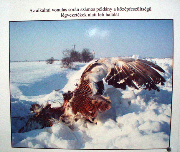 Az alacsony repülési magasság az egyik legnagyobb veszélyforrás a számukra: gyakran a villanyvezetékeknek repülnek, és halálos sérülést szereznek (8. kép). A LIFE Túzokvédelmi Program keretében ezért az alföldi élőhelyükön 11 km-nyi vezetéket föld alatti vezetékké alakítottak át. Sajnos ez nem csökkenti a vonulási útvonalon elszenvedett veszteségeket.