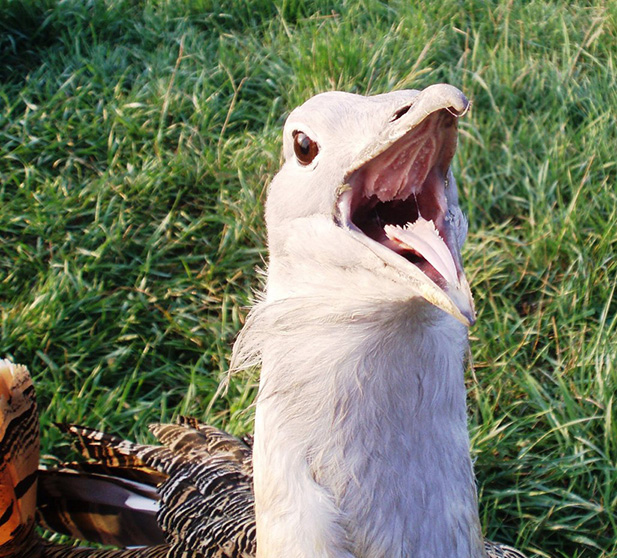 (A bezárt példány a kerítés túloldaláról sziszegett ránk fenyegetően. Igaz, önszántából jött oda, ahol mi megálltunk, kihívóan pózolt és sziszegett (5.kép). El is érte, amit akart: amikor a természetvédelmi őr figyelmeztetése ellenére átdugtam a fényképezőgépet a rácson, a kakas villámgyorsan odavágott és felsebezte az ujjamat. Nagyon büszke voltam a sebre! Hány ember mondhatja el magáról, hogy testközelbe került ezzel az óvatos, az embereket elkerülő madárral??)