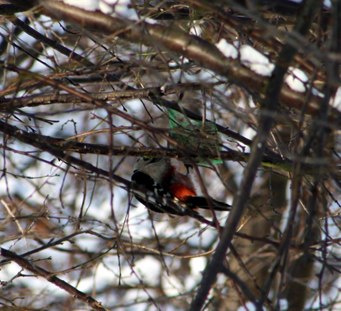 Az egyik bokron több madáretető is függ, körülöttük nagy a nyüzsgés: szén- és kék cinkék, vörösbegy, zöldike, mezei verebek csipegetnek. A cinkegolyót átmenetileg kisajátította egy nagy fakopáncs. Elnézzük egy darabig a nagy forgalmat, majd hazafelé indulunk.