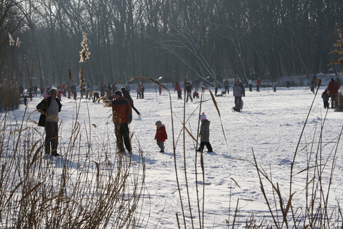 A befagyott tó benépesült korcsolyázó, csúszkáló gyerekekkel és felnőttekkel. Több pályán hokicsata folyik. Viktorral meggondolatlanul megsimogatunk egy borjú méretű kutyát, mire az örökbe fogad minket és busa fejét a kezünk alá nyomkodva újabb simogatást követel. A gazdájának hitt férfi rég elment. Ajjaj! Szerencsére szembe jön egy család és felelőtlenül ők is megsimogatják. Ezzel immár ők nyertek egy kutyát, mi továbbmegyünk.