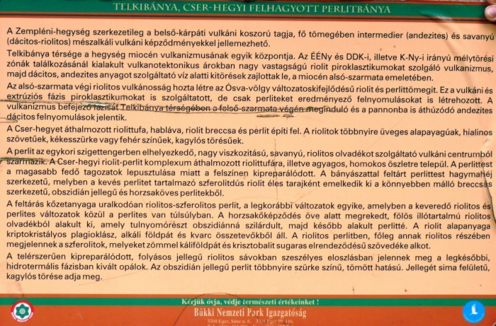 Ha maga a kőzet nem is nagyon szép, ez a belőle lett képződmény kifejezetten látványos! Amint már írtam, Telkibánya faluban, a Cser-hegy oldalában van. Azért nehéz rátalálni, mert az utca két háza közötti keskeny kis benyíló vezet oda. A fotón lévő térképen egy nagy nyíllal jelöltem a helyét.Táblát csak akkor találunk, ha már az egykori bánya udvarán állunk. A táblát a Bükki Nemzeti Park tette ki, tehát fontosnak tartották, hogy az emberek lássák ezt a szép geológiai képződményt. Mellékelem fotón a szöveget, szóljon, aki érti (és nem szakember)! Összefoglalom a lényeget: